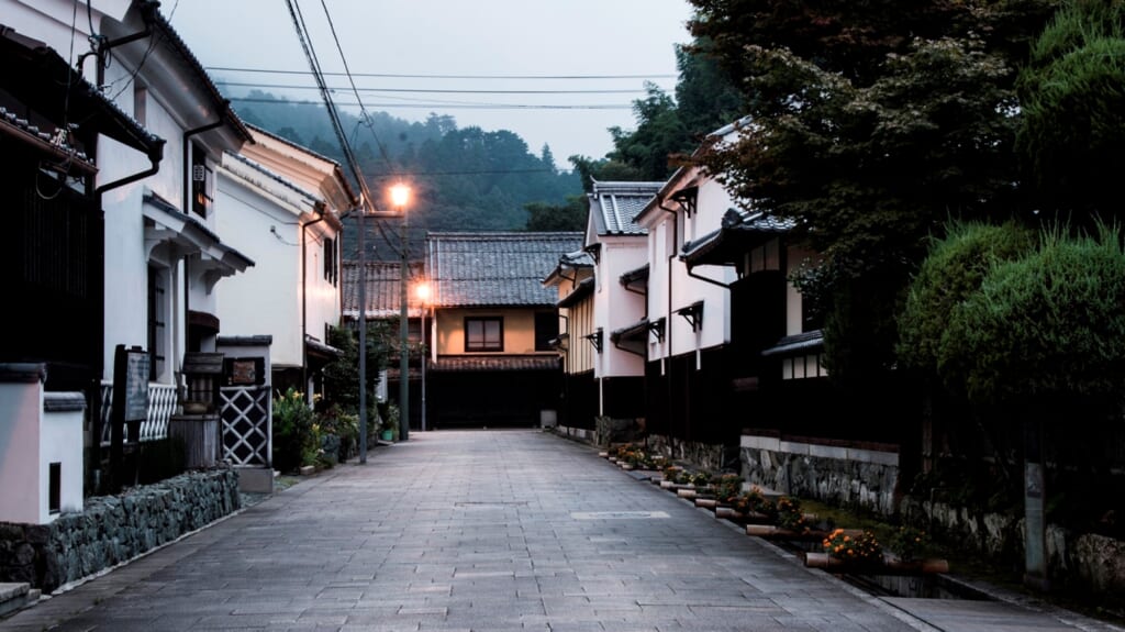 江戸時代から続く白壁土蔵と格子戸の商家。城下町の面影が、今もそのまま息づいています。