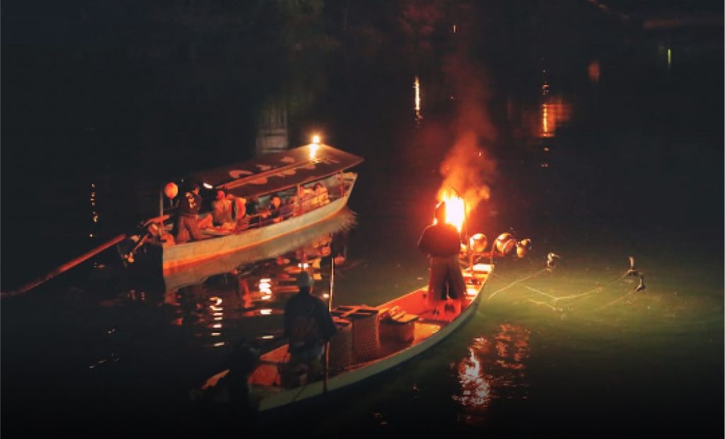 少しずつ夜の帳が下りていく中、船頭が漕ぐ舟に乗って川下り。辺りが暗くなると幻想的なかがり火を焚いた鵜舟が走り出します。鵜が水に潜る姿を間近で眺める、圧巻のひとときを。