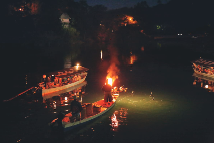 篝火に照らされた肱川。鵜飼の夜が始まる。