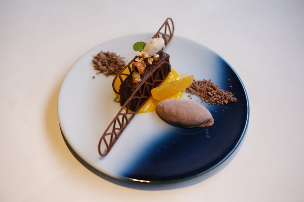 濃厚で口どけの良いショコラのムースに、柑橘ならではの爽やかな酸味と果肉の甘みを合わせた一皿に仕上げました。