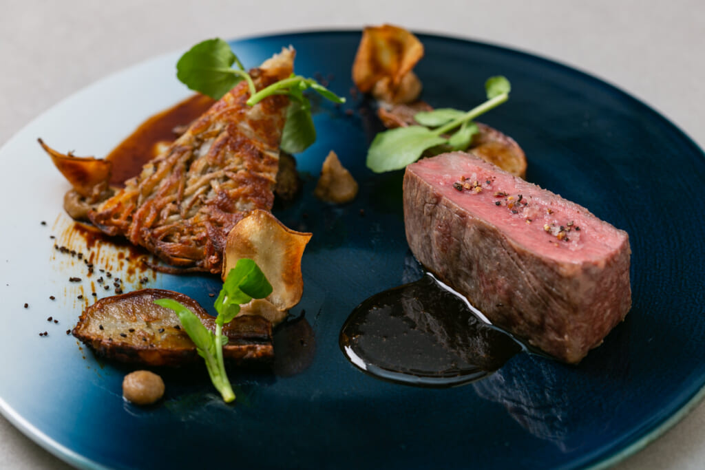 肉汁から作る芳醇なジュのソースが、しっとりとした肉の味わいを引き立て口の中で豊かな香りとコクが広がります。